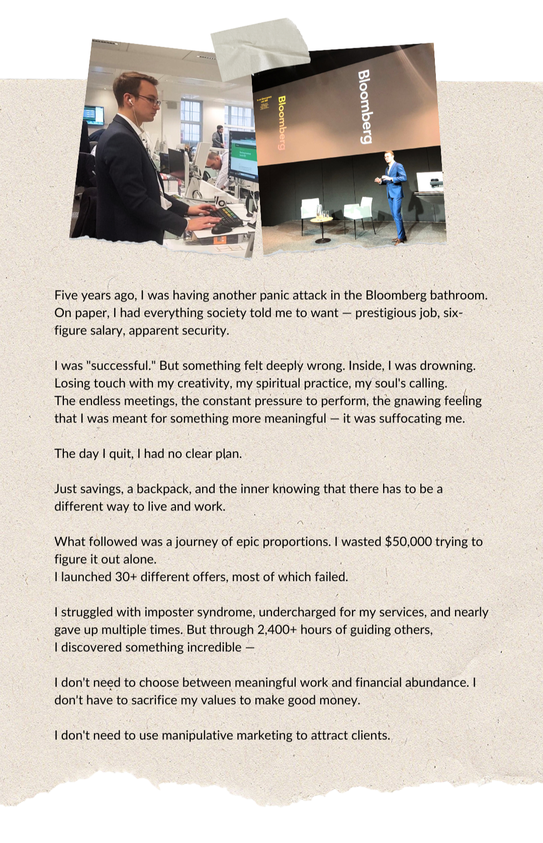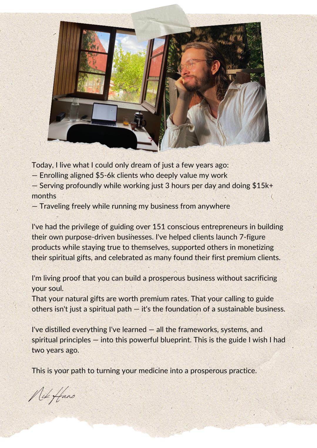 I'm sitting here in Italy, watching the sun set, and feeling a mix of excitement and vulnerability as I write this.Every struggle along my path was worth it. Because now I get to wake up every day doing work that lights my soul on fire while helping others do the same.That's exactly why I created this blueprint.Not because the world needs another business course (trust me, it doesn't).But because I keep meeting incredible souls like you β natural guides with profound gifts β who are stuck in the endless preparation phase, wondering if it's really possible to make good money doing deep, meaningful work.It is. I see it every day with my clients. And more importantly? The world desperately needs what you naturally provide.While AI replaces surface-level creators and generic coaches become obsolete, real guides who can hold space for transformation will become increasingly valuable.This blueprint isn't about teaching you how to be someone you're not.It's about showing you how to turn who you already are into a thriving business. One that serves deeply while honoring your wellbeing.If you feel called to this work β if you know in your bones that you're meant to guide others but haven't found the practical pathway to make it sustainable β then this is for you.Your medicine is needed now more than ever.I'd be honored to guide you on this journey.Love,Nik HunoP.S. If you're wondering if you're "ready enough" β that doubt is exactly why your future clients need you. They need someone who understands the journey of moving through self-doubt into embodied wisdom. Someone real. Someone like you.